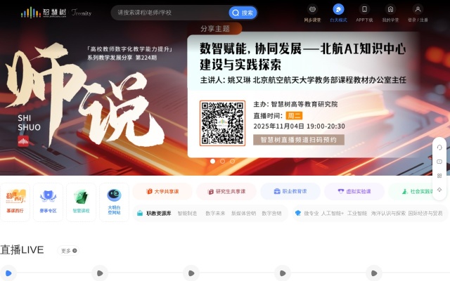 智慧树是全球大型的学分课程运营服务平台,在线教育平台拥有海量大学高品质课程,网络教育在线完美支持跨校授课,学分认证,名师名课名校,在线互动教育学堂,体验VIP级课程学习,让你成为学堂中的MVP。