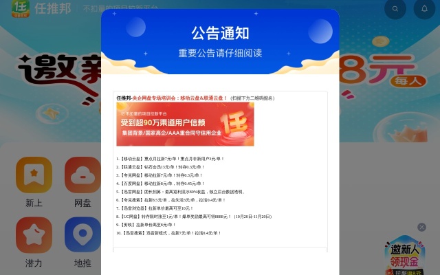 任推邦内的任务都是推广知名app,无风险。比如阿里巴巴的夸克网盘,UC网盘,迅雷网盘,知乎会员,抖音的悟空浏览器,番茄小说等几十个项目。