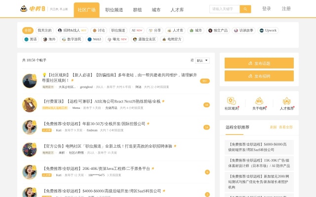 电鸭社区是具有8年历史的远程工作招聘社区,也是远程办公互联网工作者们的聚集地。在社区,我们进行有价值的话题讨论,也分享远程、外包、零活、兼职、驻场等非主流工作机会。「只工作,不上班」是我们倡导的工作态度。