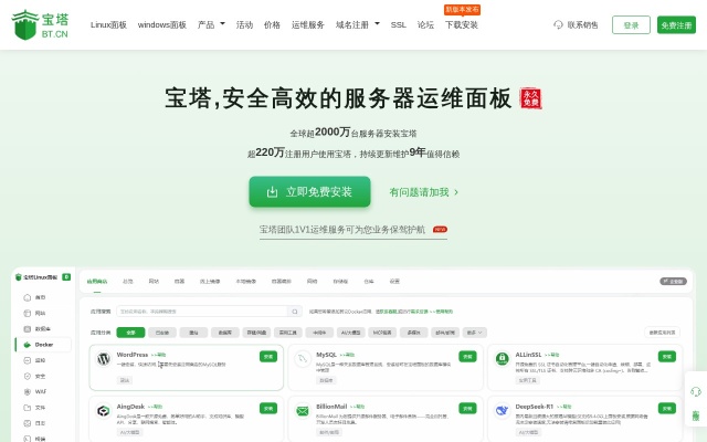 宝塔(bt.cn),让运维简单高效。面板支持Linux与Windows系统。一键配置:LAMP/LNMP、网站、数据库、FTP、SSL,通过Web端轻松管理服务器。