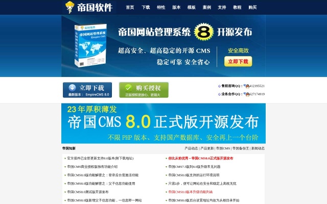 帝国软件是一家专注于网络软件开发的科技公司,其主营产品“帝国网站管理系统(EmpireCMS)”是目前国内应用超广泛的CMS程序。通过20多年的不断创新与完善,使系统集安全、稳定、强大、灵活于一身。