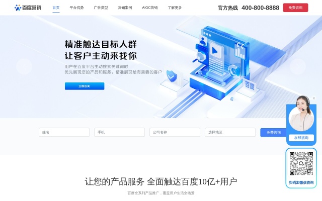 百度营销,企业网络营销首选平台,为企业提供搜索广告、信息流广告、品牌广告等多种广告营销服务,获客热线:400-800-8888。