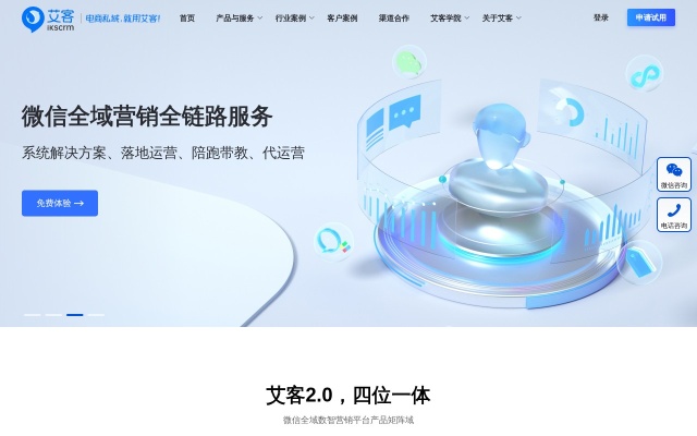 艾客scrm企业微信服务商为客户提供全程的私域流量运营平台与咨询服务,包含有企业微信营销、私域流量运营、企业微信scrm、裂变加粉、渠道活码、多渠道获客、社群营销等产品体系,有效提高企业营销转化及复购率!