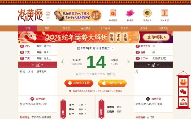 黄历网为广大网友提供最准确的老黄历看日子,今日黄历内容包括了良辰吉日,在线算命,十二生肖运程、风水学,命相学、节气查询,节日查询等还有中国传统文化习俗,老黄历致力于做中国国内最实用,最方便,最准确的黄历查询。