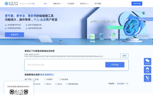 缩链网址缩短服务,支持企业用品牌域名或多个专属生成短链,提升用户点击率,减少域名封禁损失,支持企业多级账号管理,专业服务支持,提供推广数据分析,防广告劫持,全面API支持,高性价比。