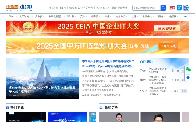 企业网(www.D1Net.com)是专注于CIO和IT决策者的精准企业级IT媒体,提供涵盖数字化转型、AI、云计算、大数据、网络安全、IT基础设施等领域的关键资讯和服务,致力于助力制造、汽车、能源、零售和医药等行业以及央国企等大中型企业的数字化升级转型,通过专业的营销、活动策划和项目合作,推动技术融合创新和商业模式演进。