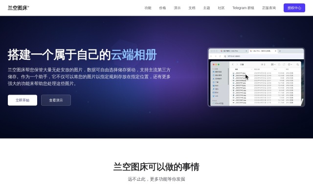 兰空图床不是一个在线的图床网站,是一个让自己搭建图床服务平台的后台程序。通过本地或者服务器上部署兰空图床,你可以拥有一个属于自己的云相册,也可以开展对外图床服务。