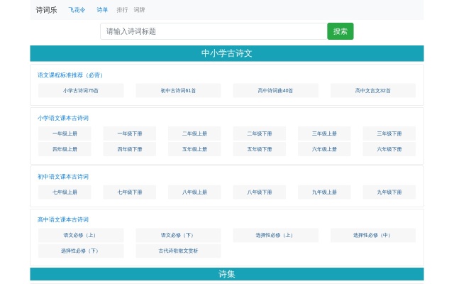 专业的古诗词网站,按照语文课程标准整理成类,涵盖小学、初中、高中的诗词和文言文。以及飞花令和宋词大全。