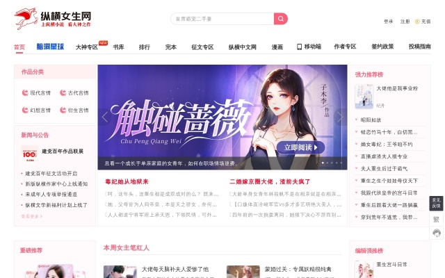 纵横中文网旗下的女频小说专区,主要提供各类言情小说、都市青春小说、穿越种田小说、豪门总裁小说、重生小说、架空小说等女生爱看的热门小说。
