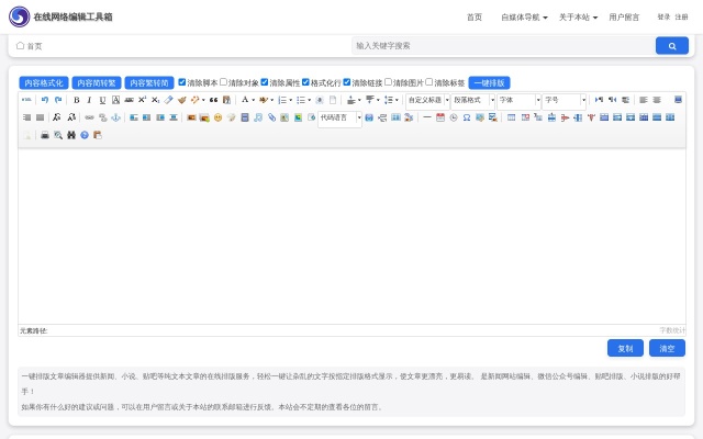 在线网络编辑工具箱,加强一键排版格式化编辑器功能,轻松在线排版文字及图片,支持文字纠错、简繁转换等其它编辑器功能。