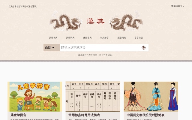 汉典是一个面向广泛受众、含有丰富及有益内容的教育和信息网站。 汉典始建于2004年,是一个有着巨大容量的字、词、词组、成语及其他中文语言文字形式的免费在线辞典。 汉典的宗旨是介绍中国文化、历史和语言,为那些在中文学习、研究方面有兴趣的人提供说明与服务,并探讨中文语言文字使用的规范和标准。