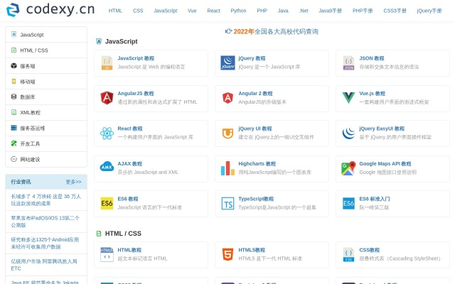 代码学院(www.codexy.cn)提供了基础编程技术教程, 介绍了HTML、CSS、Javascript、Vue、React、Python、Java、Ruby、C、PHP、 MySQL、ASP.NET等编程语言的基础知识。 同时本站中也提供了大量的在线实例,通过实例,您可以更好的学习编程技术。