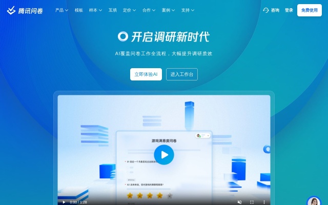 腾讯问卷提供了从问卷设计、数据收集到统计分析的一站式专业调查研究能力,平台还有超百万的在线回答小组成员,可以提供高效、精准的问卷有偿投放服务,已经被广泛应用在调查研究、表单、投票、考试等工作和学习场景,满足政府、企业、学校、团队组织等各类用户数据收集和统计分析的使用需要。腾讯问卷对通用的基础功能是永久免费的,也可以根据自身使用需求选择有更多个性化高级功能和服务的付费高级版、尊享版、旗舰版。