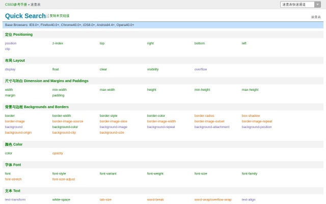 该速查表列出了CSS3的所有属性,以属性名为链接,可以快速查询相应的含义、语法、取值等内容。