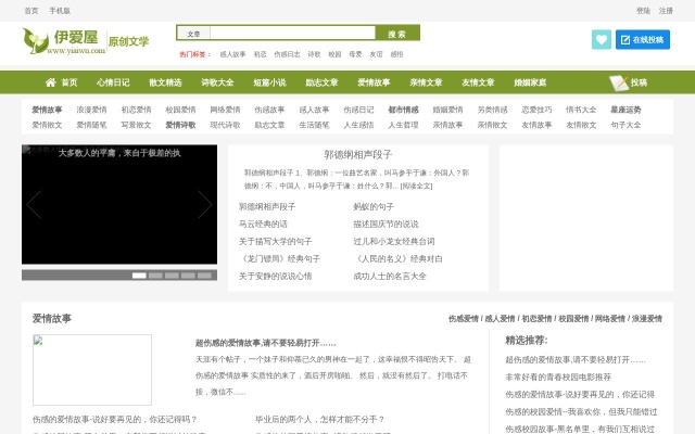爱情故事、浪漫爱情、初恋爱情、校园爱情、网络爱情、伤感故事、感人故事、伤感日记、都市情感、婚姻爱情、另类情感、恋爱技巧、情书大全、星座运势、爱情散文、爱情随笔、写景散文、爱情诗歌、现代诗歌、励志文章、生活随笔、人生感悟、人生哲理、亲情故事、亲情散文、友情故事、友情散文、句子大全
