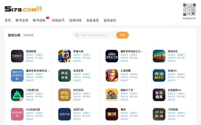 5173网络游戏服务网是国内具有影响力的网络游戏交易平台,提供手游交易、装备交易、游戏帐号交易、游戏币交易、游戏金币交易、点卡、游戏点券交易、游戏元宝交易、各类激活码交易、游戏材料交易、游戏宠物交易、游戏道具交易以及专业的代练服务,是国内安全、权威、服务完善的网络游戏交易平台。