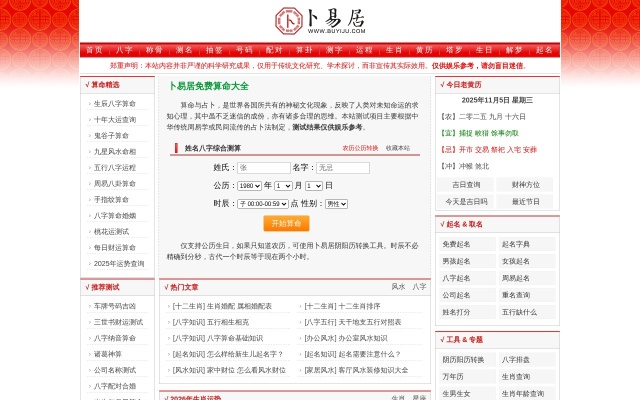 卜易居是网上算命最准的网站,主要测算项目有生辰八字算命,姓名测试,在线算命,周易算命,在线抽签,姓名算命,起名网免费测名,在线算命,老黄历查询,周易占卜,八字算命婚姻,周公解梦,万年历,周易算卦,手机号码测吉凶,姓名配对,车牌号码吉凶,塔罗牌占卜,2025年生肖运程,宝宝起名打分,起名字大全等内容。
