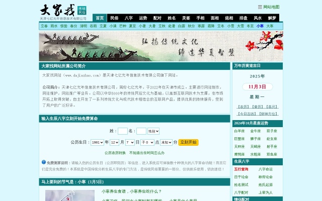 大家找算命网是天津七亿光年信息技术有限公司旗下网站,建立于2005年,前身为大家找算命网网址大全,2008年专注于提供免费算命服务,改为免费算命的专门网站:大家找算命网(www.dajiazhao.com)。