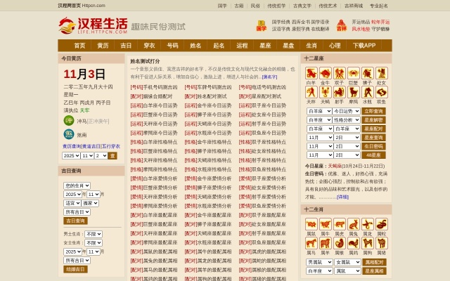 汉程生活——传统民俗文化网站,提供黄历查询/吉日查询/五行穿衣/星座运势/生肖运程/星座配对/号码测算/姓名测试打分/免费起名/周公解梦等趣味民俗内容。