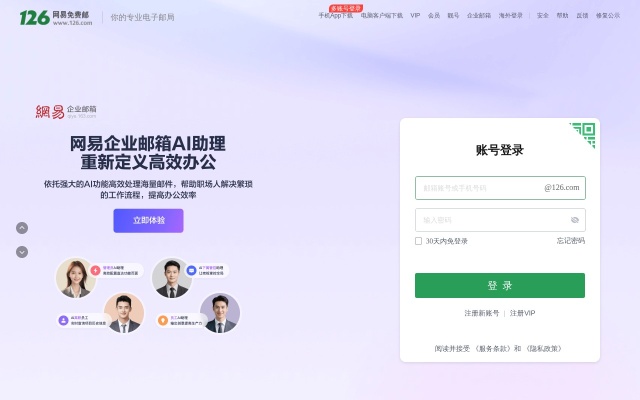 网易126免费邮箱–你的专业电子邮局,超过20年的邮箱运营经验,系统快速稳定安全,支持超大附件和网盘服务。网易邮箱官方App“邮箱大师”帮您高效处理邮件,支持所有邮箱,并可在手机、Windows和Mac上多端协同使用。