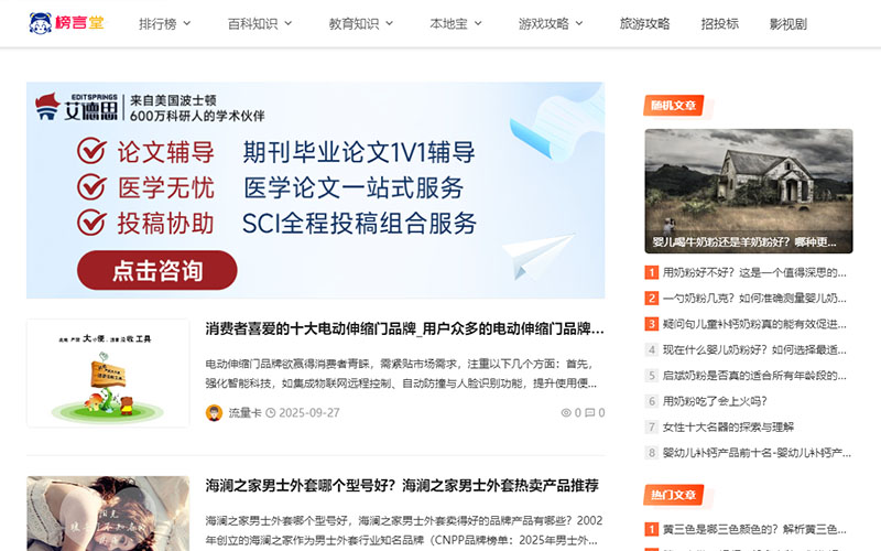 经过分析,榜言堂是采集各种信息内容发布的博客网站,以各类排行榜单为主体,每天发布大量内容来获取搜索引擎的收录和流量。截止2025年9月27日,榜言堂百度最高权重6,关键词数量11000多,每天访问量大,是一个非常成功的采集站。